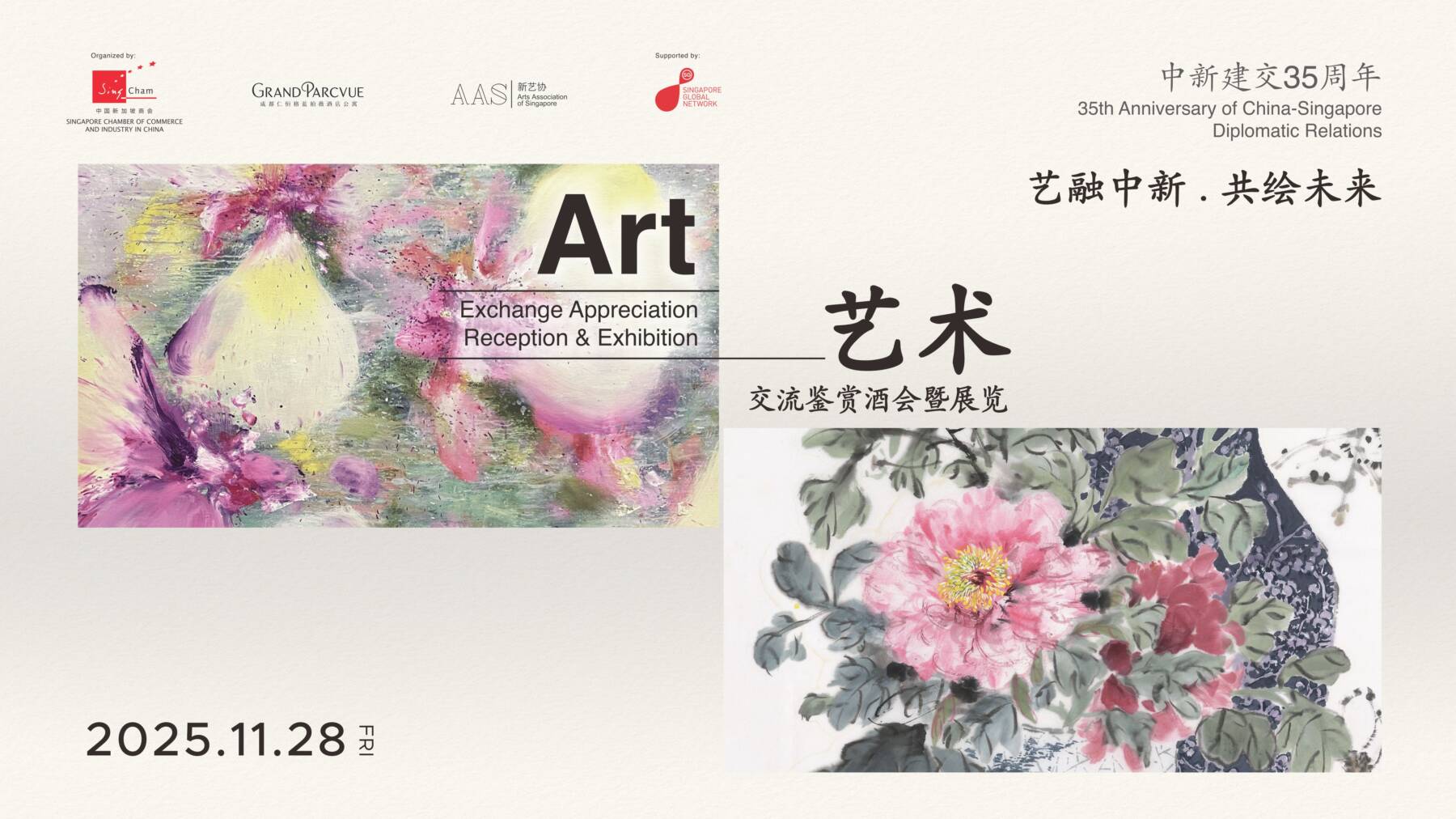 值此中国与新加坡建交35周年这一具有里程碑意义的重要时刻,一场跨越国界的艺术交流盛宴——“艺融中新·共绘未来”艺术交流鉴赏酒会暨展览,于11月28日在成都仁恒格蓝柏薇酒店公寓盛大启幕,展览将对公众开放至11月30日。此次活动不仅为蓉城带来了一场视觉与文化的双重享受,更成为中新两国文化交流与友谊传承的生动见证。